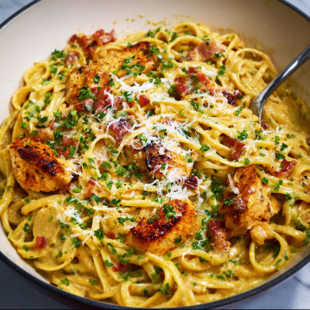 When you’re craving something comforting, creamy, and carb-loaded, this Chicken Carbonara hits the spot. Tender sautéed chicken adds protein to the classic bacon-and-egg pasta, making it a quick and easy weeknight dinner the whole family will love. No fettuccine on hand? Spaghetti, linguine, bucatini, or capellini work beautifully too.