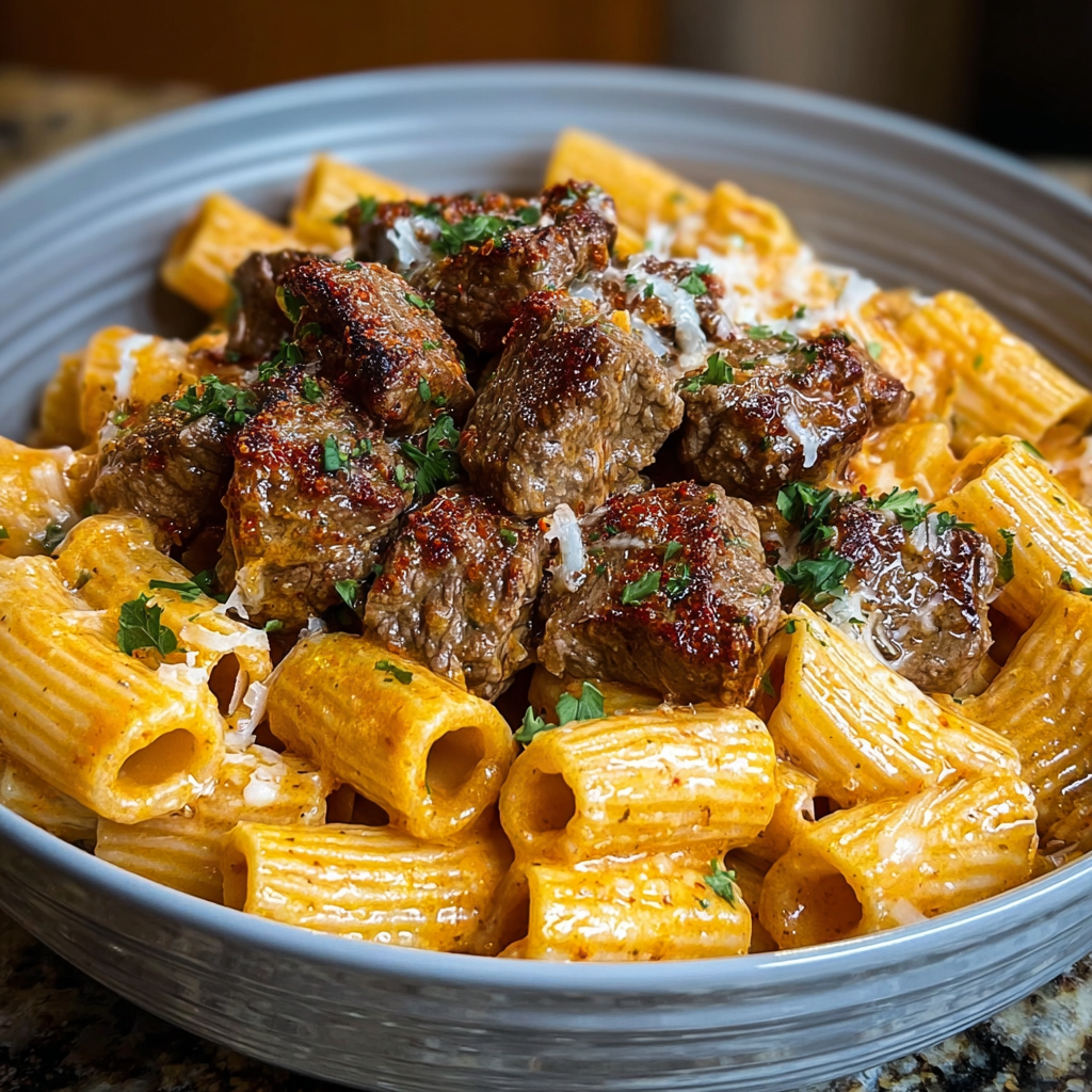 Add the cooked rigatoni to the sauce and toss to coat. If the sauce is too thick, use a splash of the reserved pasta water. Fold in the steak tips gently to keep them juicy.