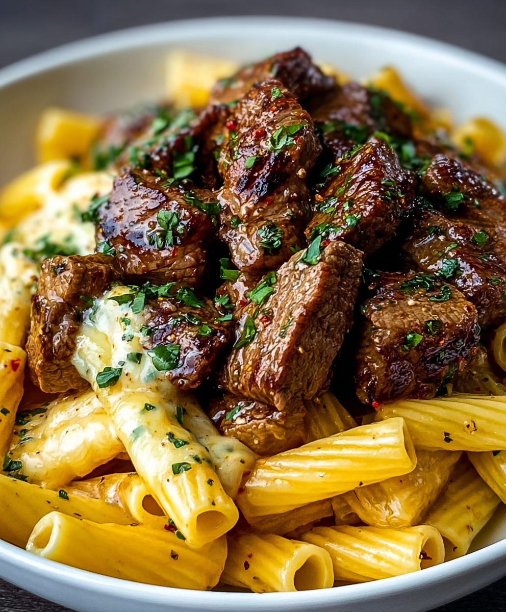 Garlic Butter Steak Tips with Cheesy Rigatoni