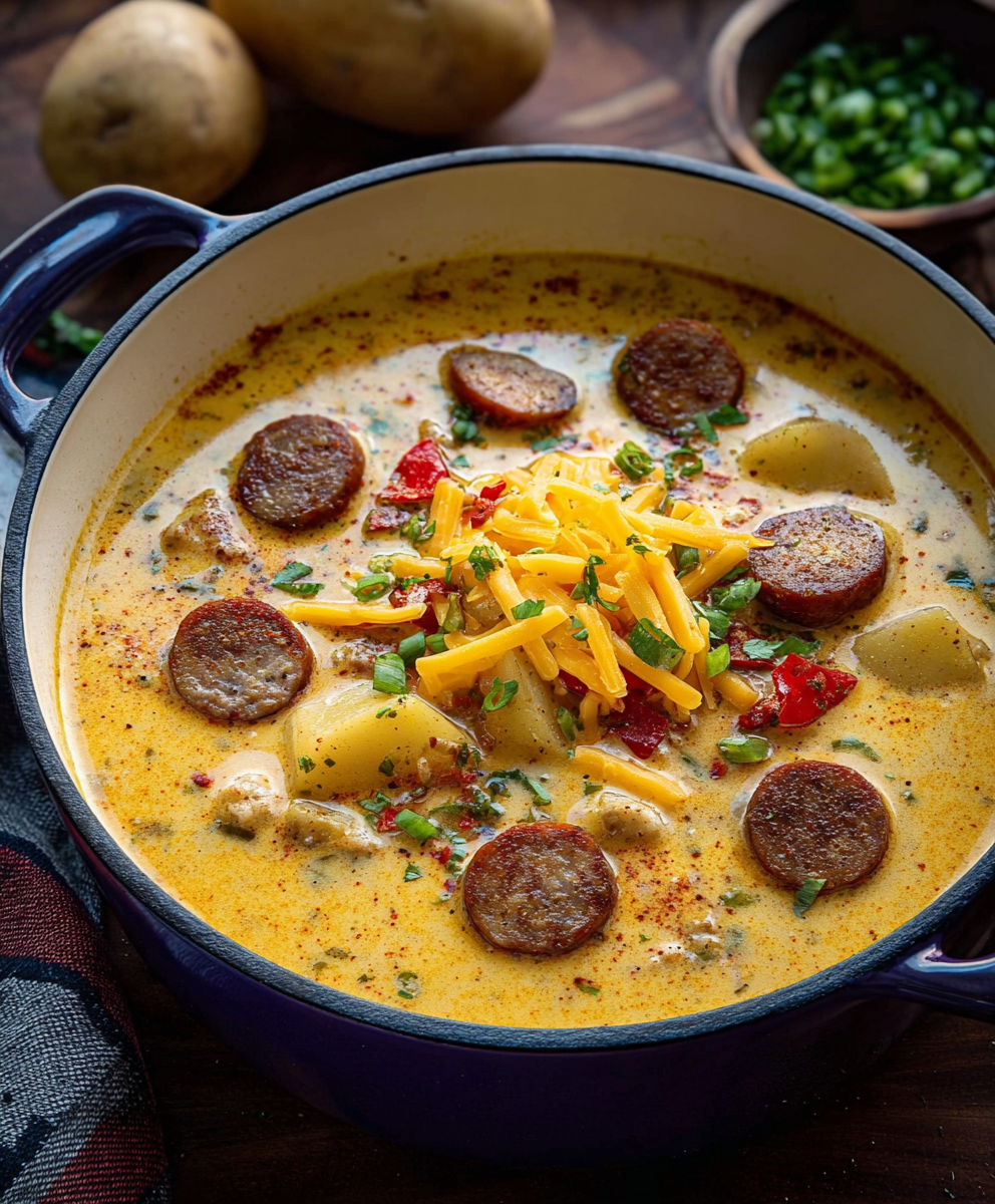 Spicy Cajun Potato Soup with Sausage and Cheese