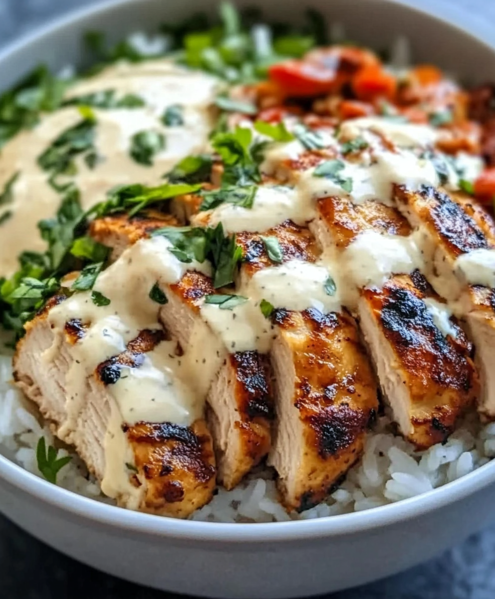 the best Chicken & Rice Bowls with Creamy Garlic Sauce