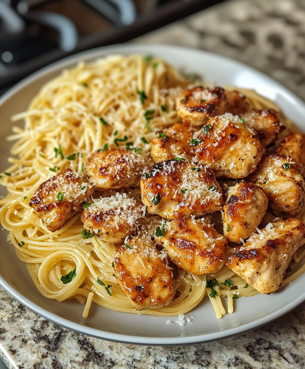 the best Garlic Butter Chicken Bites with Creamy Parmesan Pasta