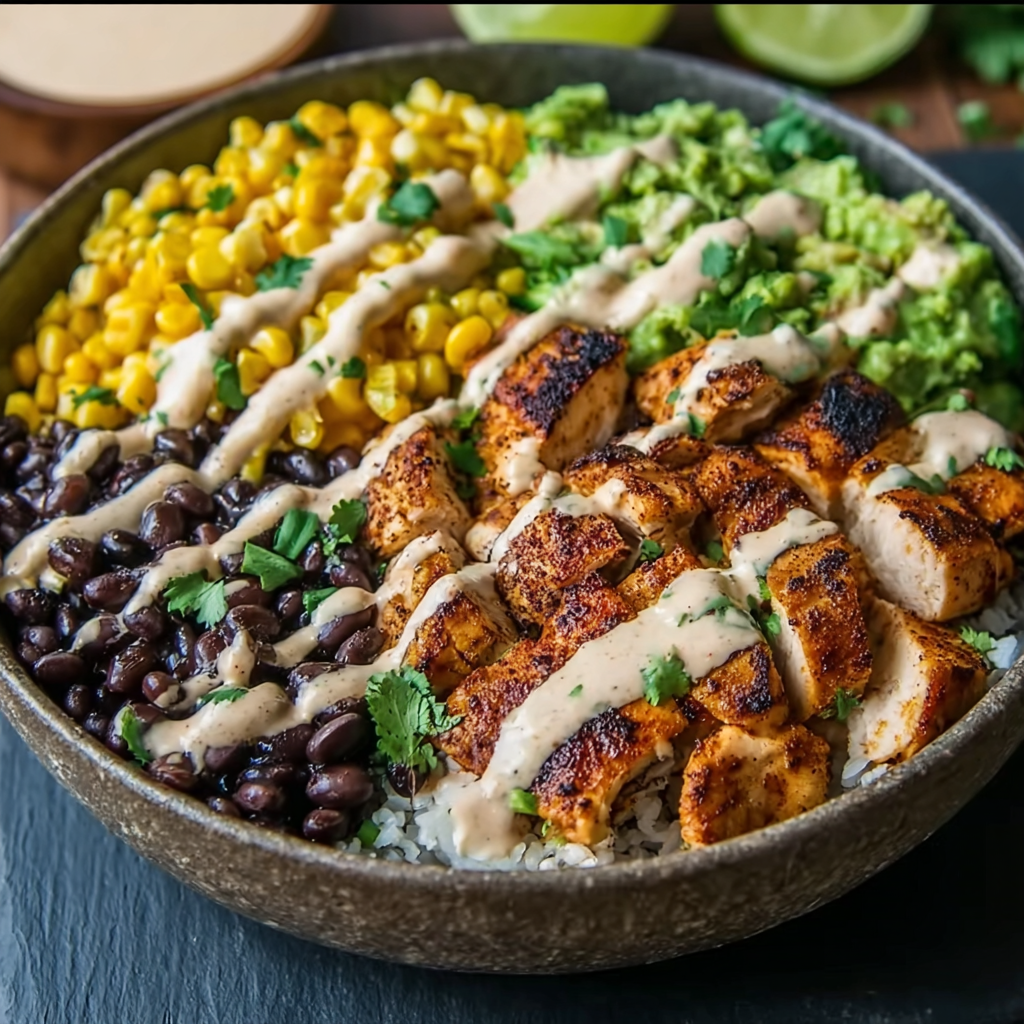 Serve the bowl warm so the chicken stays juicy and the creamy sauce melts into the beans and corn.