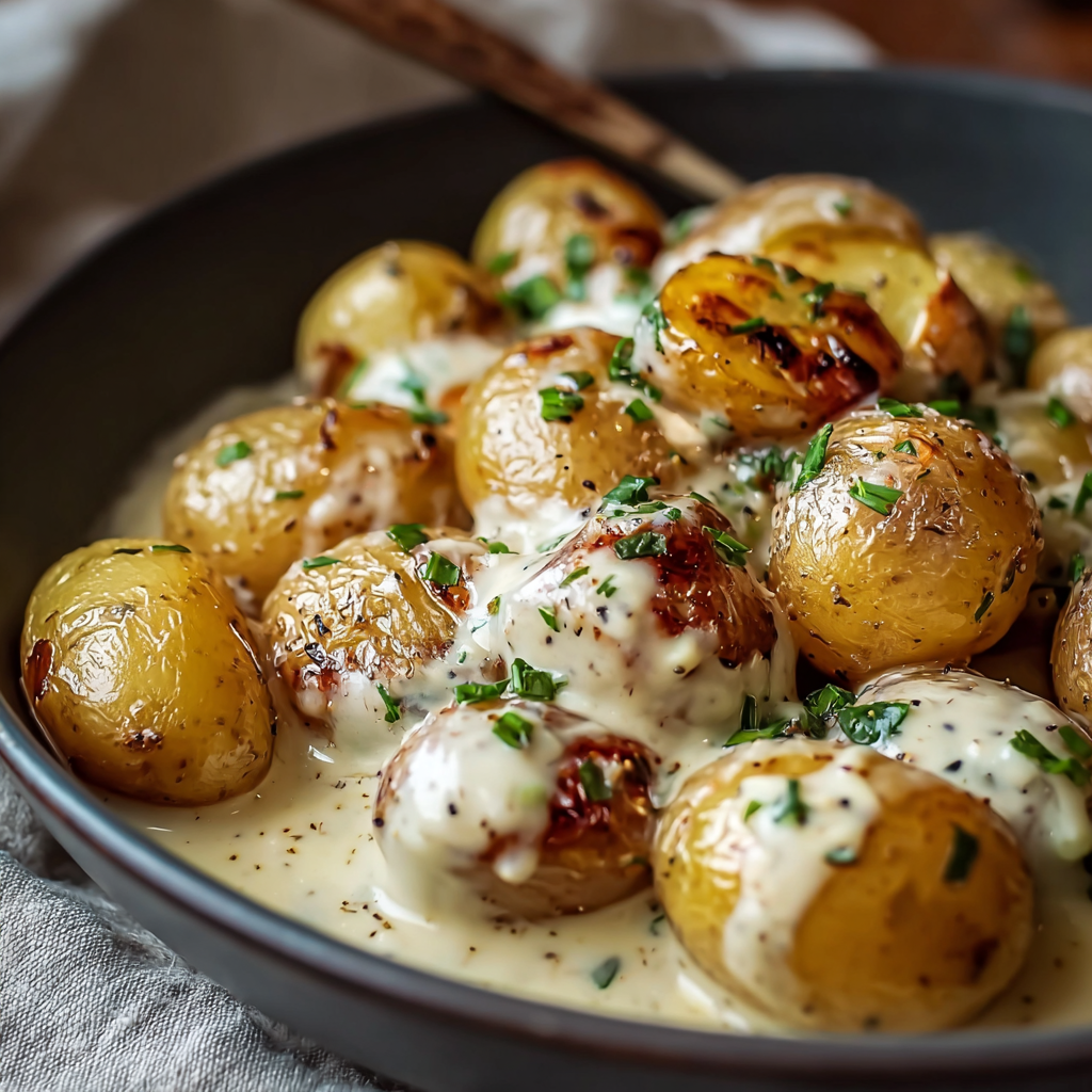 Golden roasted baby potatoes in a velvety garlic-Parmesan sauce, topped with fresh parsley — the perfect side for any meal.
