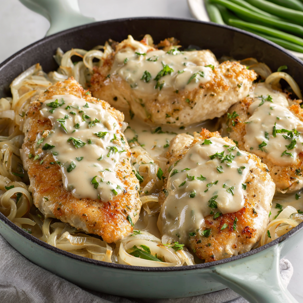 Return the seared chicken breasts to the skillet, coating them with the creamy onion sauce.