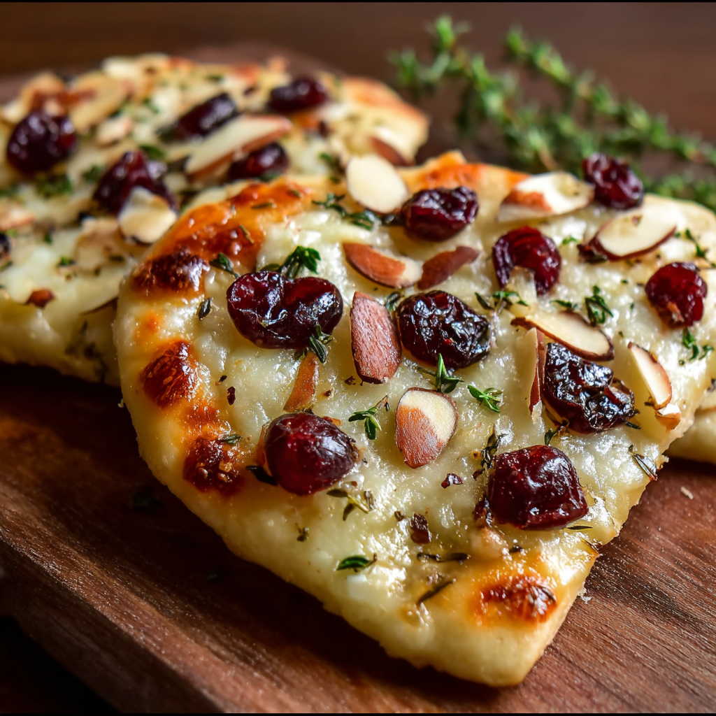 Transform simple flatbreads or naan into a festive, crowd-pleasing treat! Each crisp base is topped with creamy brie, tart dried cranberries, and nutty toasted almonds. A drizzle of honey and a sprinkle of fresh thyme, sea salt, and cracked black pepper elevate the flavors, creating a perfect balance of savory, sweet, and crunchy. Quick to assemble and bake, this flatbread is ideal for appetizers, snacks, or a light lunch that feels extra special.