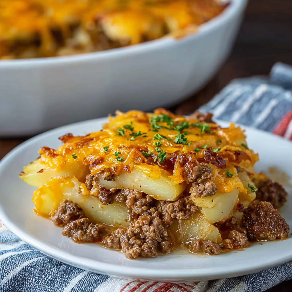 This dish brings together a few pantry staples — ground beef, potatoes, cheese, and creamy mushroom sauce — to create a meal that’s both satisfying and simple. Each bite delivers layers of savory beef, tender potatoes, and melty cheddar in a rich, creamy sauce. It’s comfort food at its best.