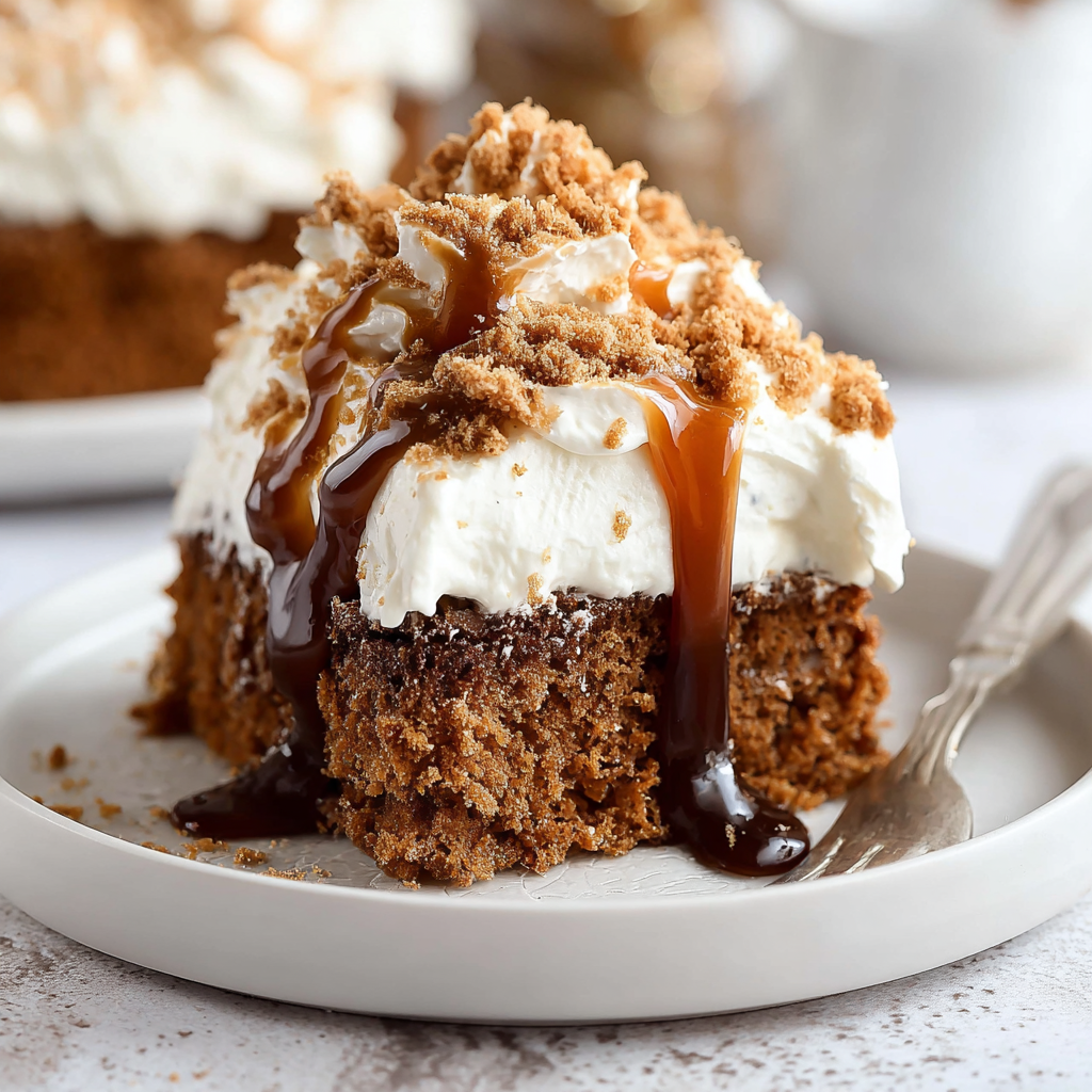 ‘Tis the season for cozy sweets, and this Gingerbread Poke Cake is holiday magic in every bite. Picture a spiced gingerbread cake soaked in sweet caramel goodness, topped with a fluffy, cinnamon‑nutmeg whipped cream layer, and finished with a crunchy gingersnap crumble. It’s everything festive wrapped up in one unforgettable dessert.