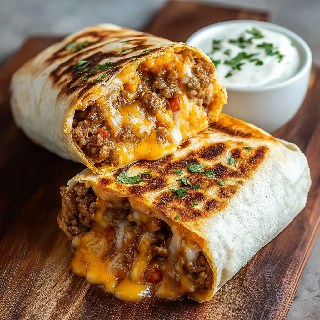 If you love Taco Bell’s iconic Grilled Cheese Burrito, you’ll adore this homemade version. Layers of seasoned beef, creamy nacho cheese, rice, sour cream, and chipotle sauce are wrapped in a warm flour tortilla—and then grilled with even more cheese on the outside for a golden, crispy crust. Quick, cheesy, and utterly satisfying, this burrito can be ready in under 30 minutes!