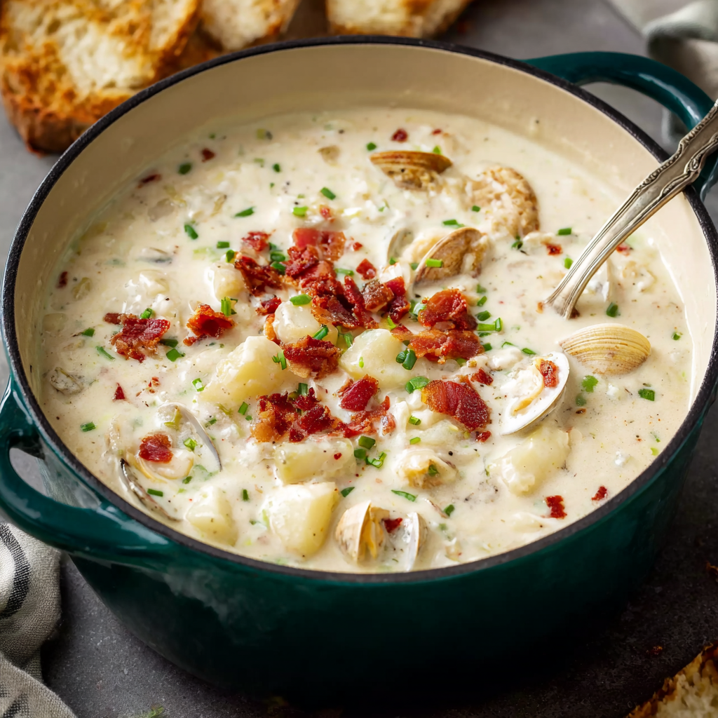 This rich and creamy New England Clam Chowder is loaded with tender clams, crispy bacon, perfectly cooked potatoes, and a silky broth that tastes like it came straight from a seaside restaurant. With simple ingredients and easy-to-follow steps, you can enjoy this classic comfort food right at home — no trip to the coast required!