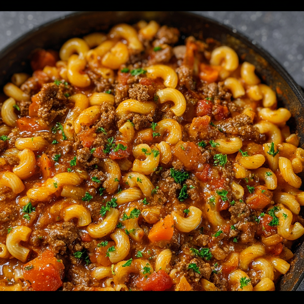 This version—American-style—is all about ease and flavor: ground beef, elbow macaroni, tomato sauce, and savory herbs that make it feel like home.