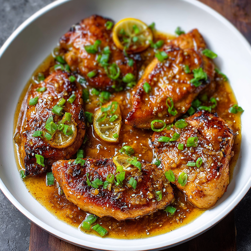 Plate the chicken, drizzle remaining sauce, and top with sliced green onion. Serve hot.