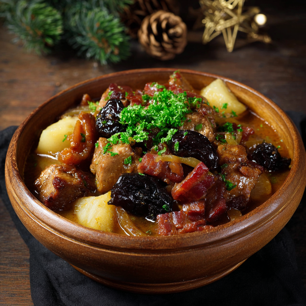 Celebrate the cozy winter nights of Middle Earth with a rich and hearty pork stew that’s as satisfying as it is flavorful. Inspired by the rustic fare of the Dwarves deep in the Misty Mountains, this stew features tender pork, smoky bacon, sweet apples, and luscious prunes, all slow-braised in a flavorful cider-spiced broth.