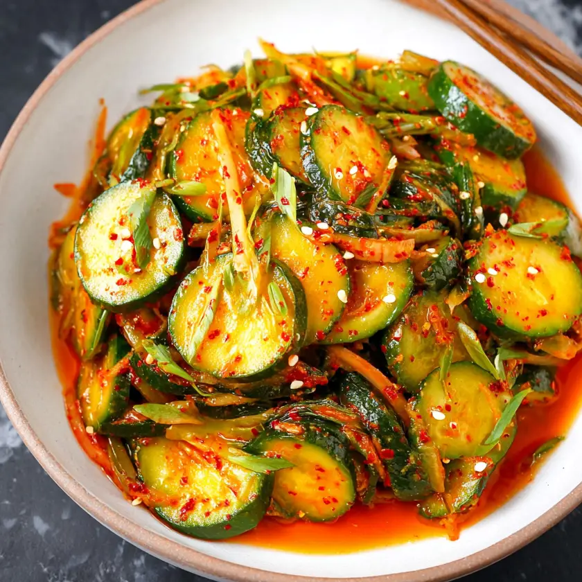 This quick cucumber kimchi is a fast and refreshing side dish you can whip up in just 20 minutes. It’s crisp, tangy, a little sweet, and packed with savory, garlicky, and spicy flavors — perfect for everyday meals or a late-night snack with rice. No fermentation needed!