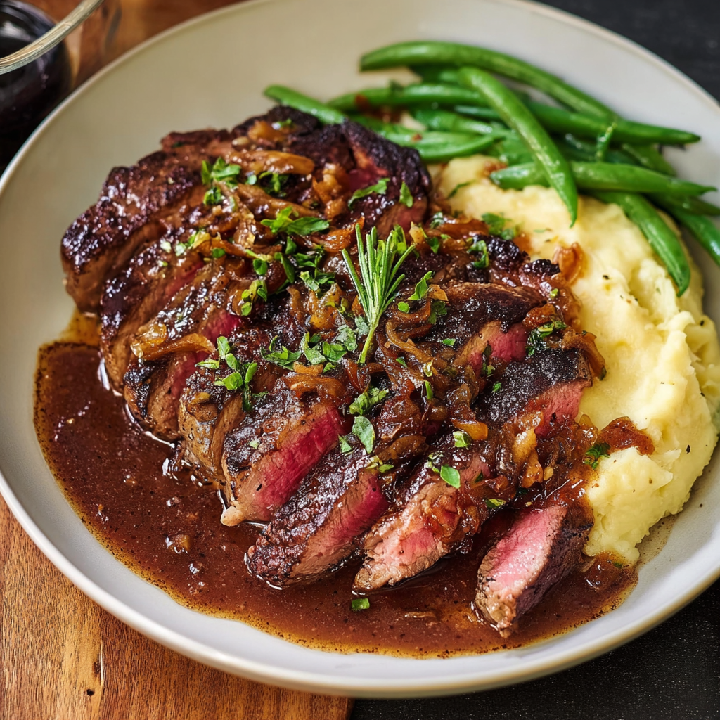 ✨ Balanced sides – creamy chive mashed potatoes and tender green beans complete the plate.