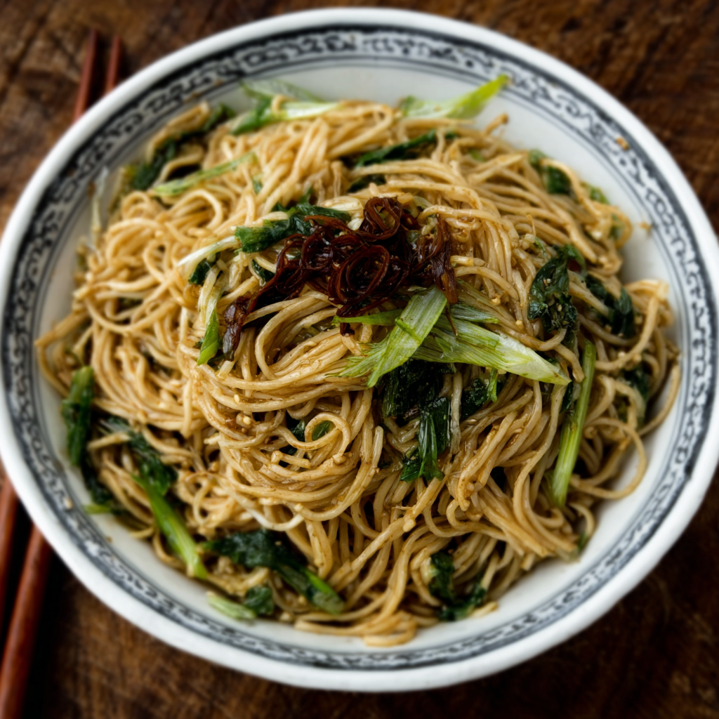 Known in Chinese as 葱油拌面 (cōng yóu bàn miàn), Scallion Oil Noodles are a staple of Shanghai cuisine. The dish combines chewy noodles with a rich brown sauce made from soy sauce, scallion oil, and sugar.