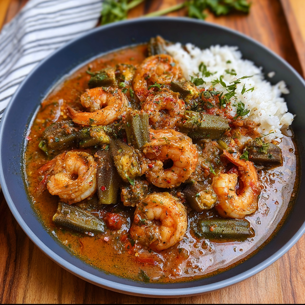 A rich, comforting Southern dish made with tender okra, tomatoes, shrimp, and Cajun seasoning.