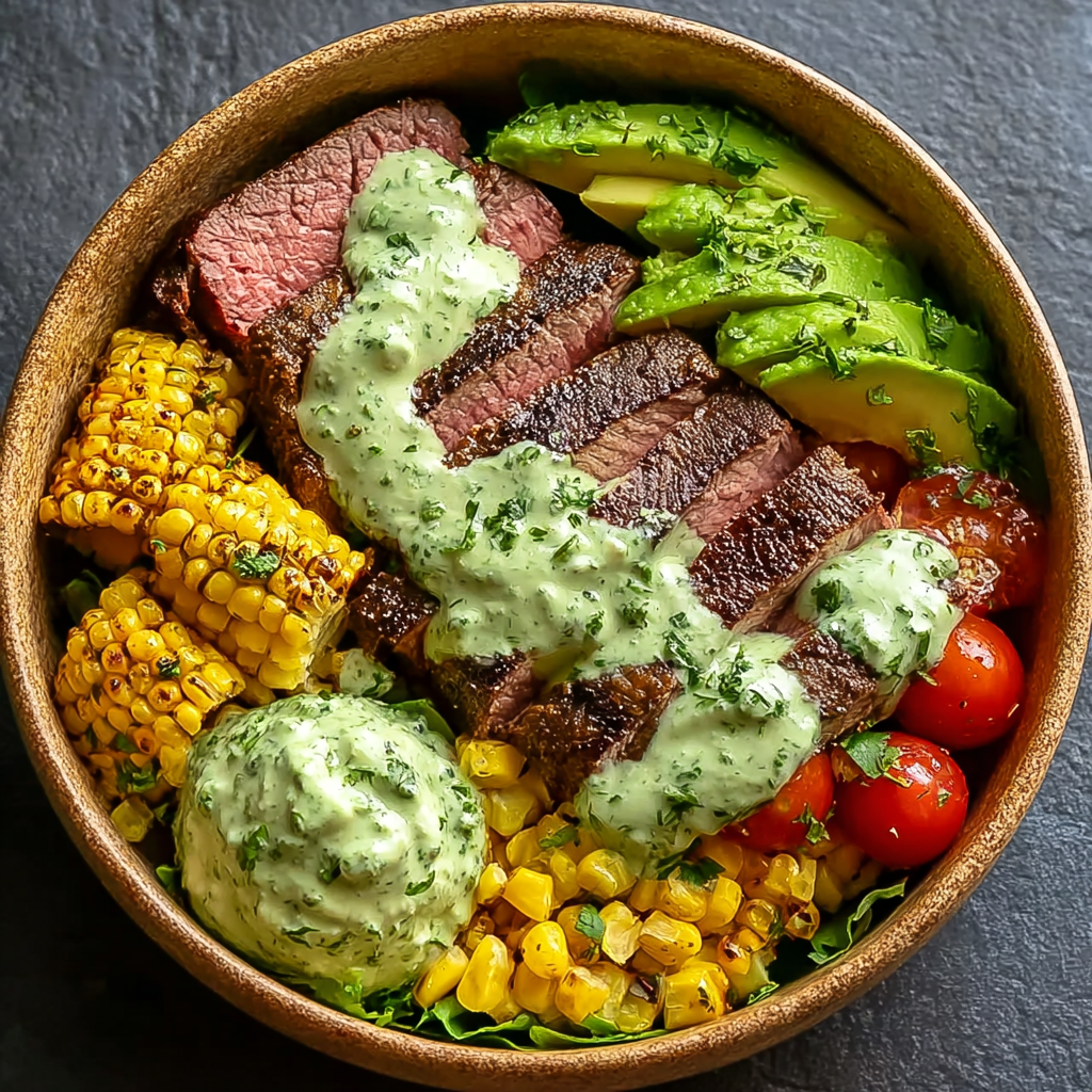 A vibrant, flavor-packed bowl layered with juicy steak, creamy avocado, sweet roasted corn, fluffy quinoa, and a zesty cilantro cream sauce.