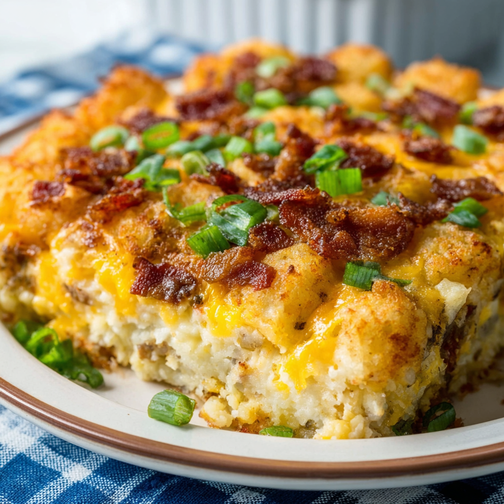 - Rest & serve: Let the casserole sit for about 10 minutes before slicing. Garnish with reserved bacon and green onions.