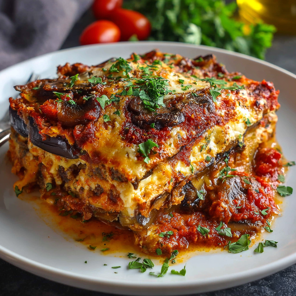 ✨ Healthier Alternative: Swapping pasta sheets for roasted eggplant drastically reduces carbs and calories.